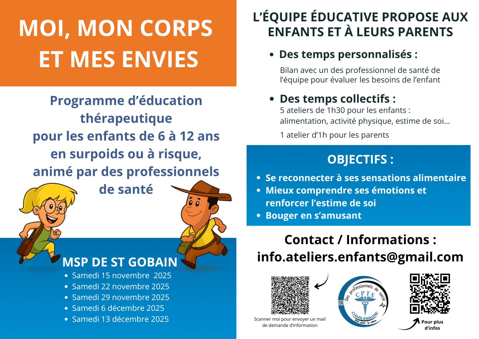 - 5 ateliers collectifs (image de soi, émotions, nutrition, activité physique) et un atelier pour les parents.